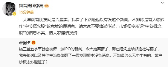 【大河财立方消息】9月25日,针对“字节跳动准备赴港上市”传闻,抖音集团副总裁李亮回应称“不排除是有人想炒作‘字节概念股’故意放的假消息。请大家不要信谣传谣鼎冠策略资,市场很多所谓‘字节概念股’的信息不实,请大家谨慎投资”。