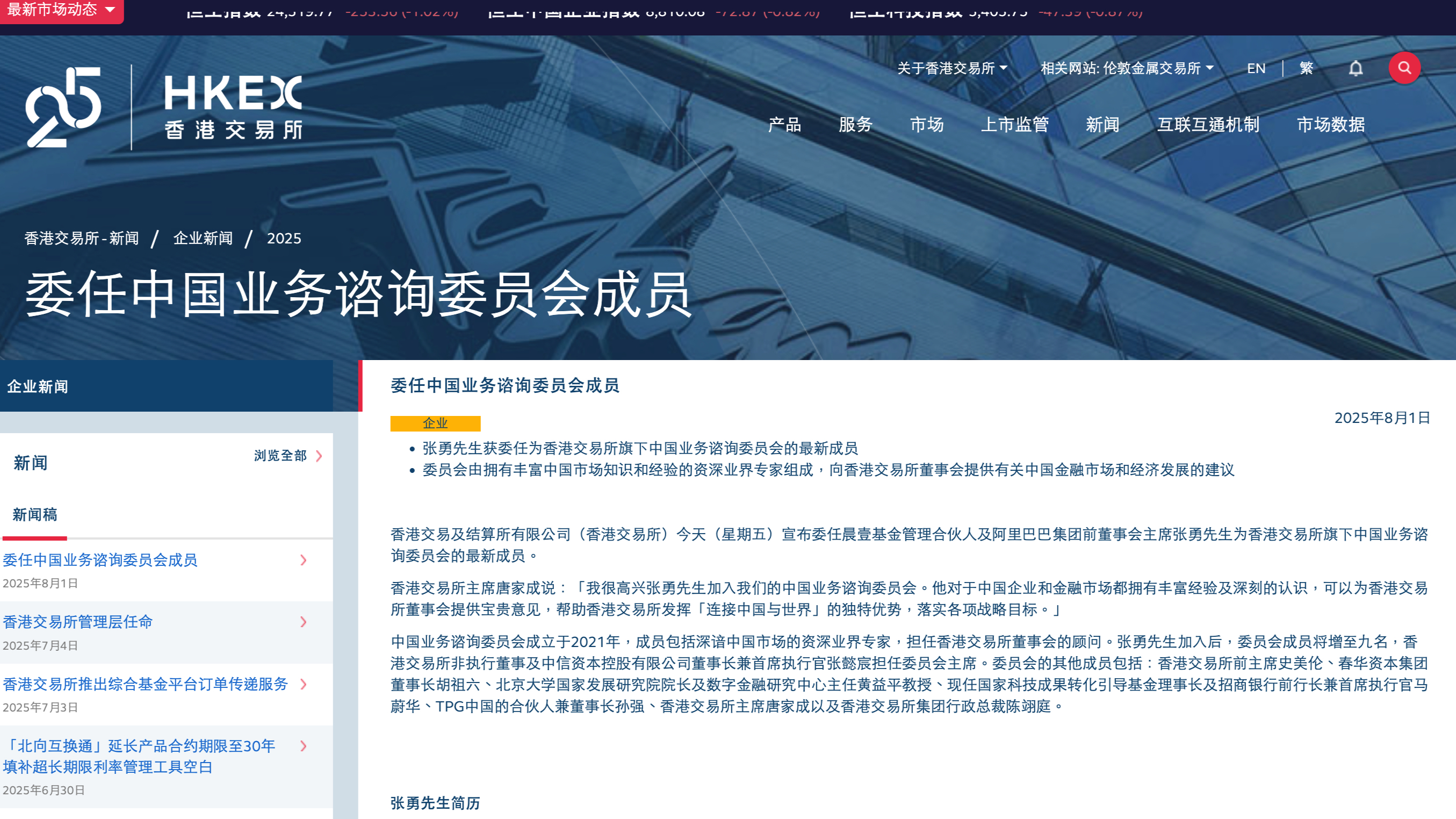 前阿里巴巴CEO张勇履新,加入港交所旗下中国业务咨询委员会张勇获委任为香港交易所旗下中国业务咨询委员会的最新成员恒信期货。