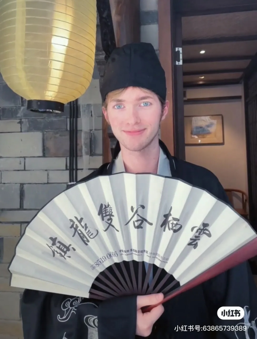 苏州拙政园里,斯拉夫小姐姐穿粉色纱质襦裙,手执团扇走过九曲桥,与古典园林相映成趣;西安鼓楼前,英国小哥穿着黑色龙纹长袍、戴上金丝翼善冠,摆出“帝王 pose三件套”;上海田子坊茶馆内,法国博主用折扇半掩着脸,拍了一套“文人雅士” 写真,还幽默发帖。