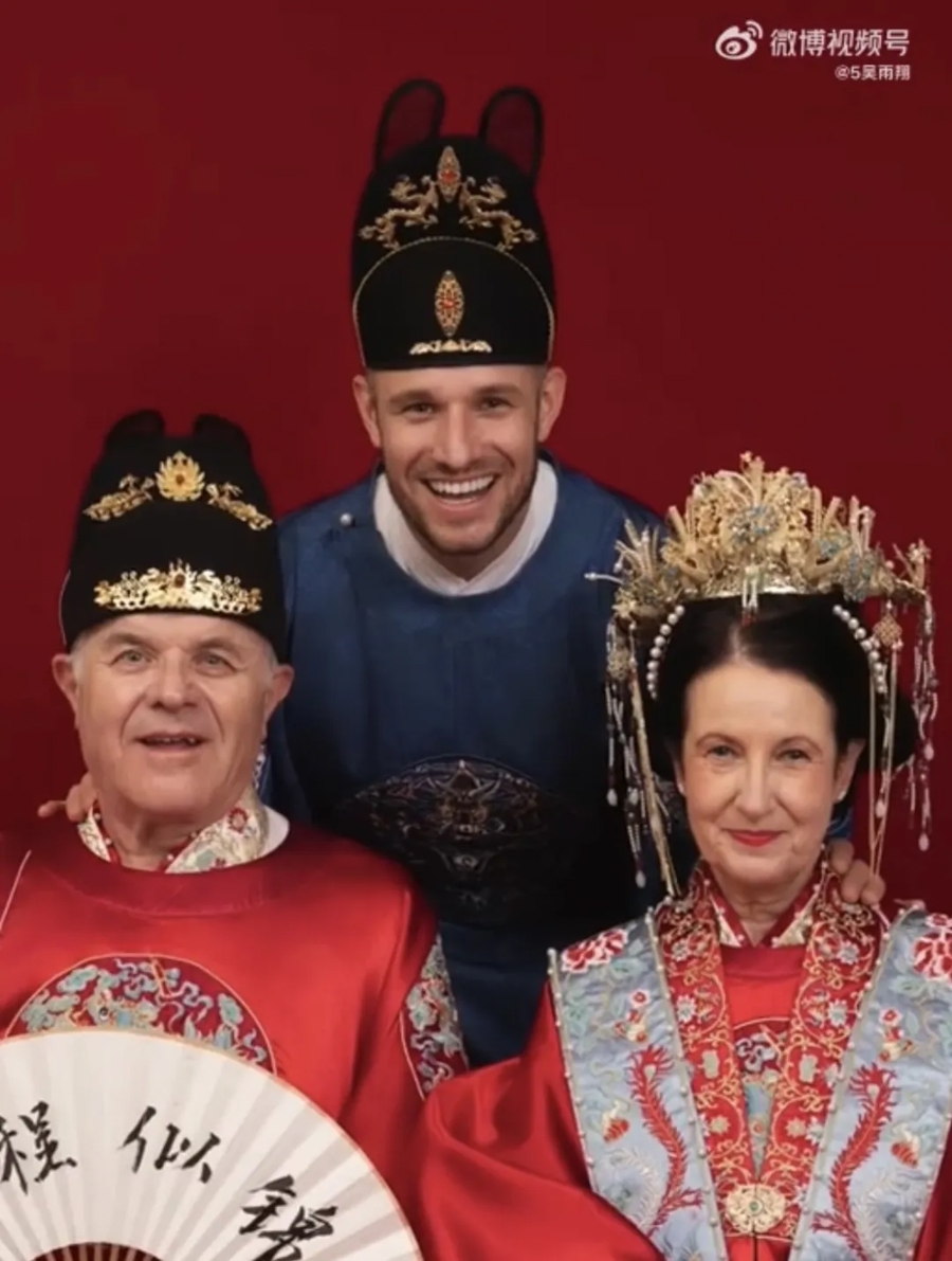 德国博主吴雨翔则带着父母拍汉服婚纱照,他为爸妈准备明制大红喜袍。当母亲戴上中式的凤冠,穿上华丽的霞帔,小哥感叹 “美丽无国界”。